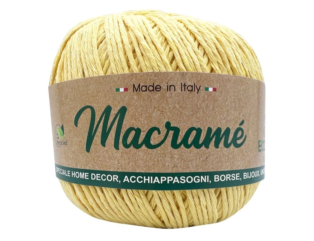 Il cordoncino Macrame Barbante è un filato green sostenibile 80%cotone 20%poliestere, 100%riciclato, spessore 2 mm, gomitoli da 150 grammi 200mt. certificata oeko-tex®, prodotto interamente in italia a biella, ferri uncinetto 3-4mm, Il cordoncino non si attorciglia ed è possibile tagliarlo a qualsiasi lunghezza. Ottimo per home decor, decorazioni da parete, acchiappasogni, borse, tende, bijoux,uncinetto e maglia